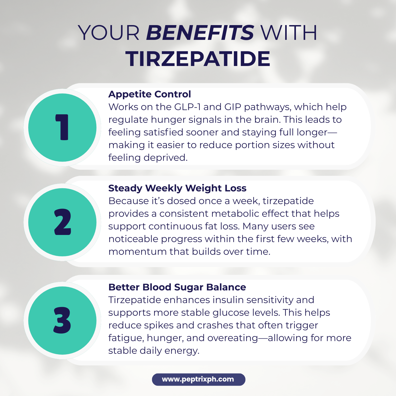 Tirzepatide helps curb appetite, stabilize glucose, and support weekly weight loss. Its dual-hormone action keeps cravings low and energy balanced. A simple weekly dose delivers steady, sustainable results.