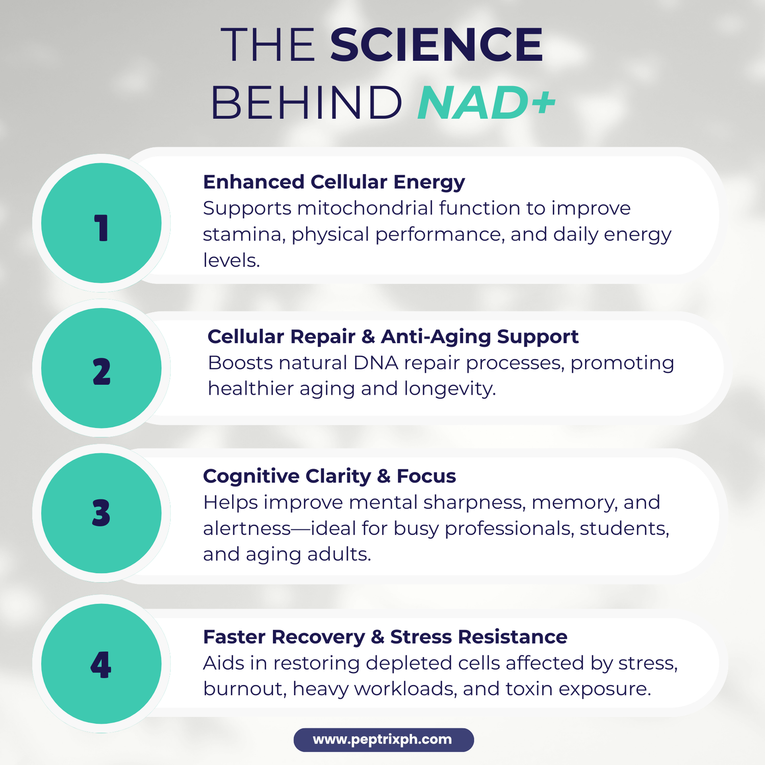NAD+ (Nicotinamide Adenine Dinucleotide) is a vital coenzyme found in every cell of the body. It supports energy production, DNA repair, and cellular resilience—making it essential for healthy aging and overall vitality.